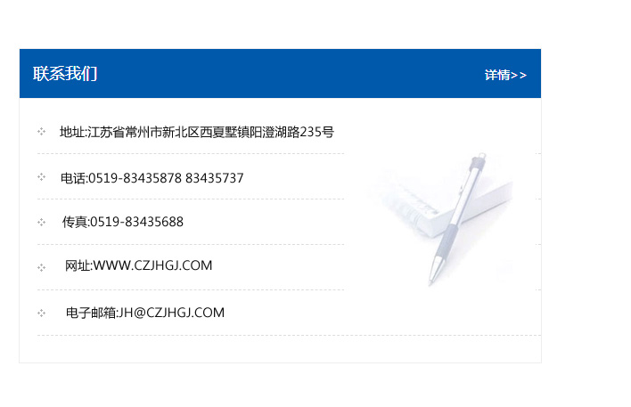 地址:常州市新北區友邦商務大廈1幢16、17層  電話:0519-85101652  傳真:0519-85112595  郵編:213022  網址:www_cz-jiayue_cn.zjwjgas.com  郵箱:xiajifengaa@163.com